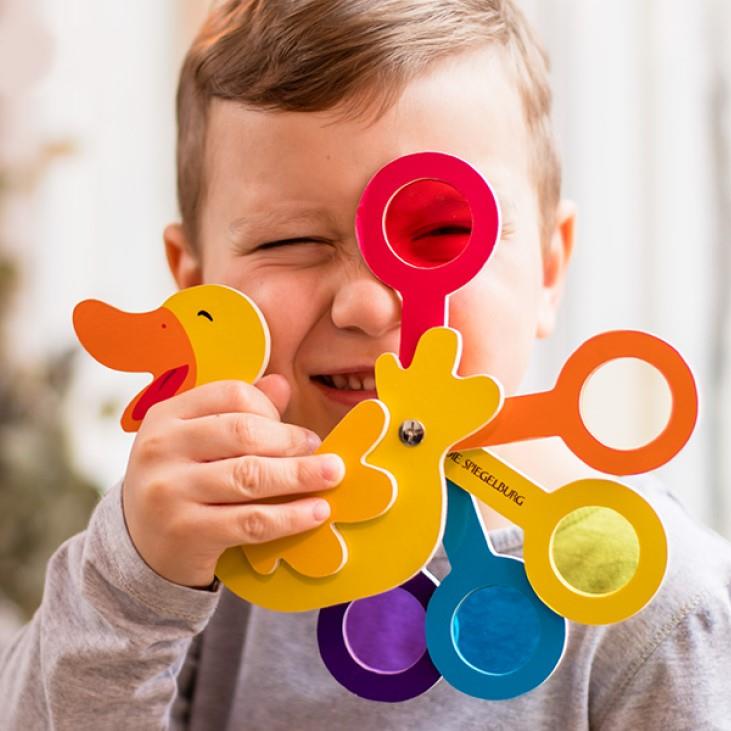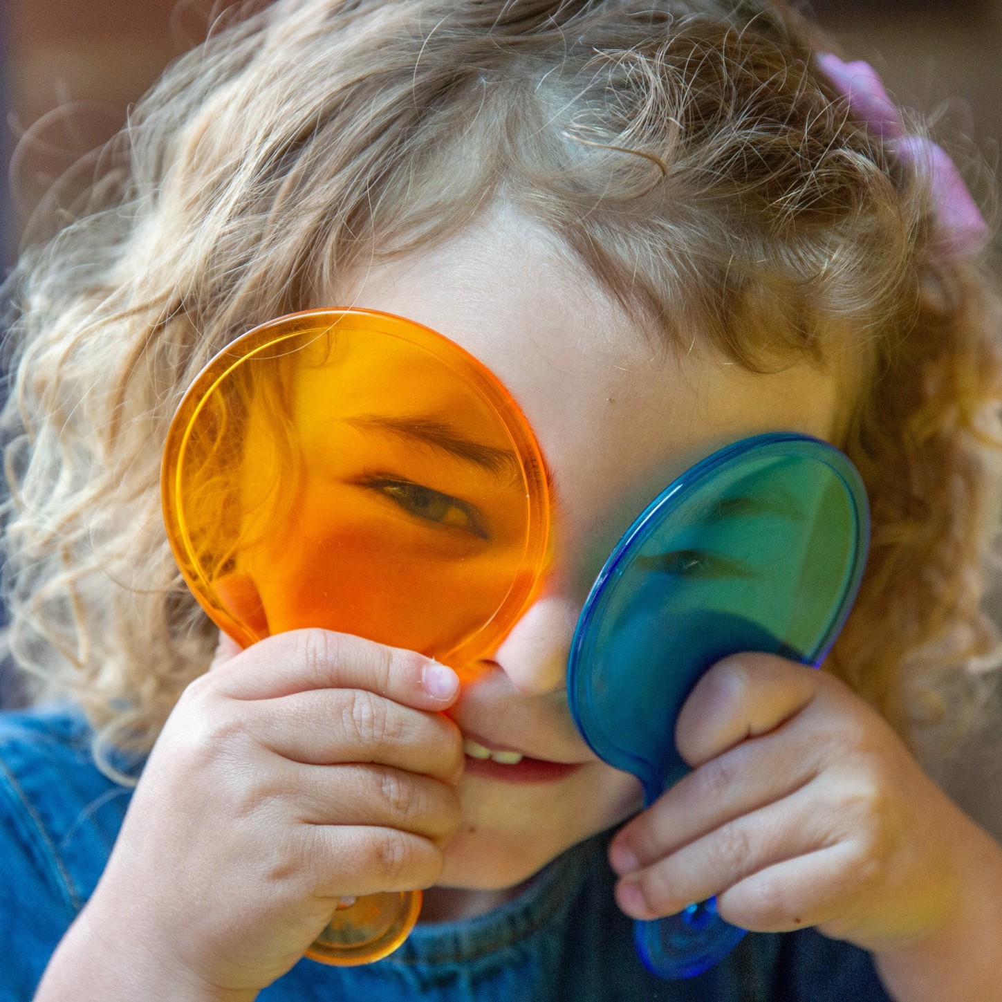 Un recurso sensorial imprescindible para explorar la luz, el color y la mezcla cromática. Un juego sensorial divertido y muy interesante para experimentar con los colores. Pon la paleta rojo en tu ojo y mira el mundo ¡verás los árboles rojos! pero si pones la amarilla y luego la azul ¿Qué crees que ocurrirá? Un estupendo juego para aprender los colores primarios y sus mezclas.