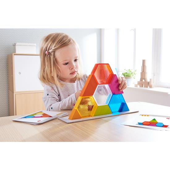 Un precioso juego que combina la construcción con los reflejos cromáticos, mezclando piezas de colores de madera de haya sostenible y piezas de plástico de colores de efecto translúcido, con las que crear las combinaciones más variopintas en vertical u horizontal. Se pueden seguir las plantillas de dificultad progresiva o jugar libremente explorando la creatividad. Ideal para fomentar la motricidad fina, la coordinación mano-ojo, el lenguaje y el reconocimiento de colores y formas. Medidas: los prismas, cada uno 7 x 8 x 2 cm. ¿Qué encontrarás dentro de la caja?