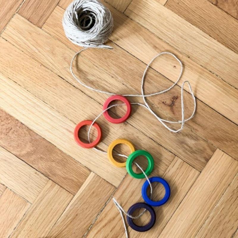¡Magníficas estas anillas de madera, pintadas a mano en gama de colores básicos! Estos Anillos de Madera Arcoíris de Grapat son sostenibles y gracias a su carácter poco estructurado, permiten que la imaginación de los niños vague libremente: los anillos se pueden apilar, clasificar, contar, colgar, enrollar y los niños incluso pueden colocar sus Grapat Nins® en su interior. Este material propone su exploración para desarrollo de la creatividad. Puede ser empleado con el resto de material heurístico de Grapat y también mezclarse con las piezas para Mandalas que encontraréis en nuestra web. Apto a partir de 10 meses. Diámetro de las anillas 4 cm. Calidad y garantía Spiel-Gut.
