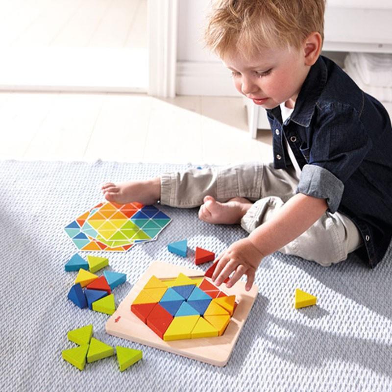 ¿Cómo preferís jugar, de manera libre y creativa o de forma ordenada? En este juego son muchas las posibilidades. Explora sus 36 triángulos en 6 colores brillantes y no tóxicos, porque verás cómo pueden combinarse de maneras diferentes dentro del marco de madera. Pero si lo deseas, también podrás jugar fuera del marco para crear otras figuras. La diversión en el juego está garantizada independientemente de si se llevan a la práctica los modelos de las plantillas o si se realizan creaciones propias. Un estupendo juego geométrico para desarrollar el aprendizaje matemático, la coordinación mano ojo y la creatividad.