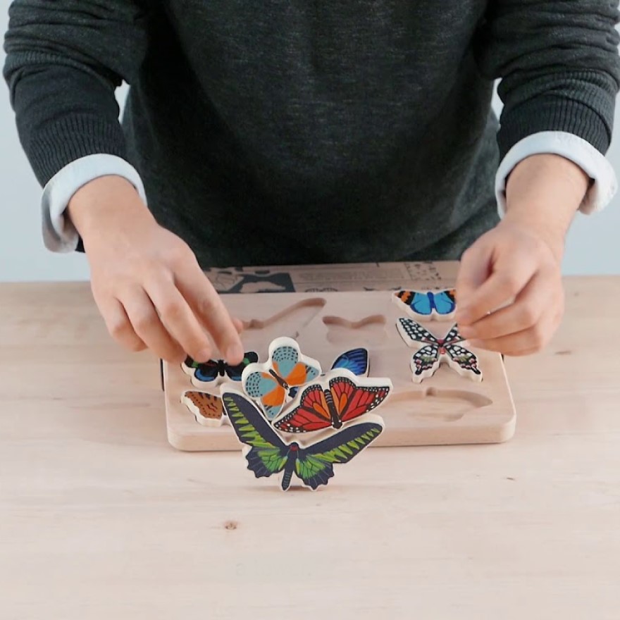 Este hermoso rompecabezas de madera es una alegría para encajar, clasificar, apilar y jugar. Nuestro rompecabezas se compone de un robusto tablero de madera de haya y 8 majestuosas mariposas impresas por ambas caras. Desencaja las mariposas del tablero, apílalas una encima de las otras o clasifícalas por tamaño y colores en una fila que atraviesa la sabana, el rompecabezas tiene una delicada textura por su acabado fino. Un maravilloso puzzle para clasificar por tamaños y reconocer los diferentes tipos de mariposas. ¿Cuál es la Monarca? ¿Y la Trogonoptera Brookiana? Un encajable para desarrollar la coordinación ojo-mano, y descubrir el inmenso mundo de los lepidópteros . Apto a partir de 2 años. Calidad Bajo.