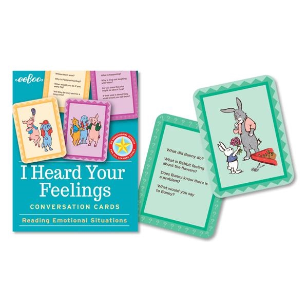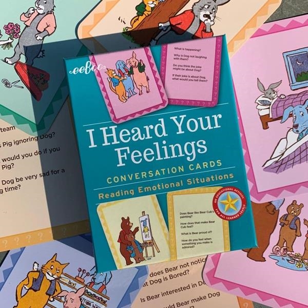 Cada tarjeta de conversación presenta un escenario común, como ser elegido para un equipo o romper un jarrón accidentalmente. Las preguntas en el reverso de cada tarjeta invitan a padres e hijos a discutir lo que está sucediendo y cómo se sienten los personajes en cada escena. Al observar los rostros y las posturas de los personajes y reflexionar sobre las propias experiencias de los niños, estas tarjetas ayudan a los niños a reconocer la dinámica emocional en una variedad de situaciones, al tiempo que generan conversaciones importantes sobre los sentimientos y la socialización.