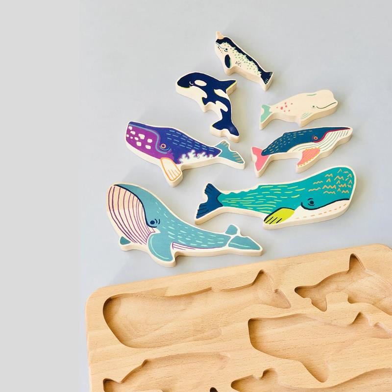 Este hermoso rompecabezas de madera es una alegría para encajar, clasificar, apilar y jugar. Nuestro rompecabezas se compone de un robusto tablero de madera de haya y 8 majestuosas Ballenas impresas por ambas caras. Desencájalas del tablero, apílalas una encima de las otras o clasifícalas por tamaño y colores en una fila que atraviesa el mar, el rompecabezas tiene una delicada textura por su acabado fino. Un maravilloso puzzle para clasificar por tamaños y reconocer los diferentes tipos de Cetáceos ¿Cuál es la Jorobada? ¿Y la Beluga? Un encajable para desarrollar la coordinación ojo-mano, y descubrir el inmenso mundo de los cetáceos, muchos en peligro de extinción. Apto a partir de 2 años. Calidad Bajo.