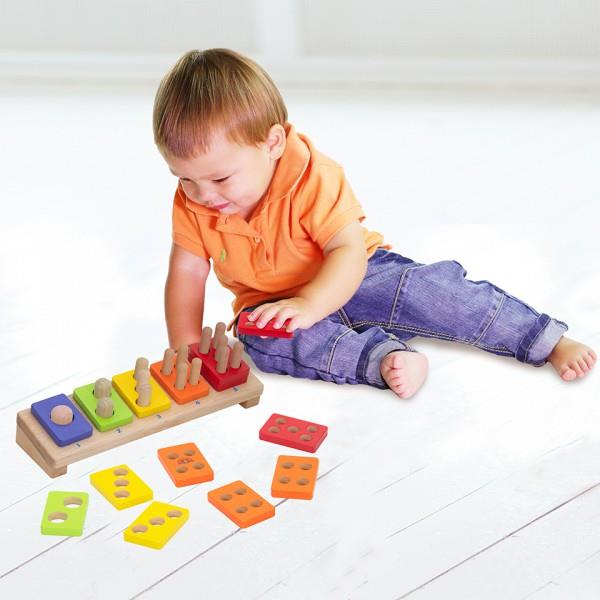 Diseñado con una base inclinada que permite al niño una mayor visión. Apilando cada pieza en la correcta posición se podrá ver los números del 1 al 5 también ordenados. De esta manera los niños podrán aprender a apilar, números y colores. ¡Un juguete clásico con un diseño renovado! Dimensión: 9x29x10 cm.