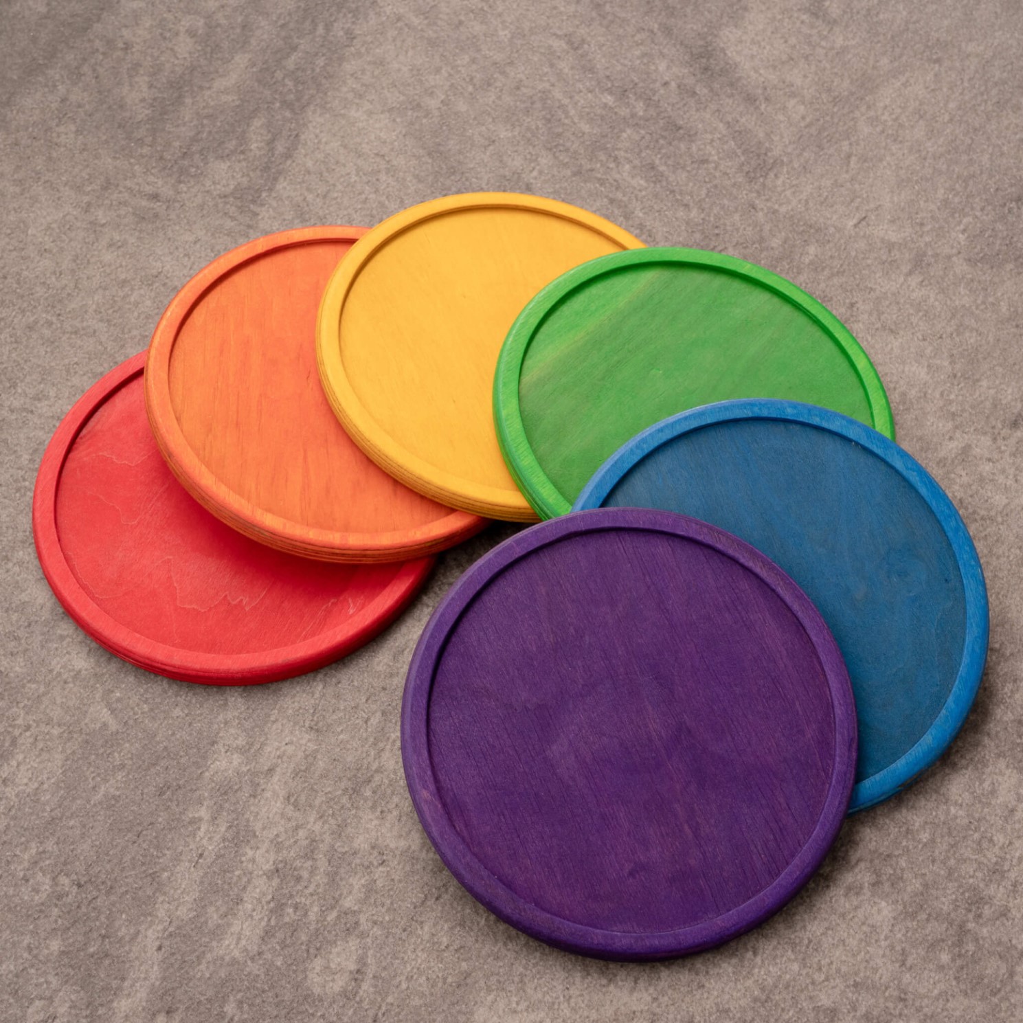 6 Bandejas Arcoíris Grapat. Las 6 Bandejas Arcoíris de Grapat son un auténtico apoyo al juego, permiten ordenar Nins, monedas, anillas o piezas sueltas varias del juego para ordenarlas por colores y dejar espacio a la imaginación del niño. Cada bandeja mide 18 cm de diámetro.