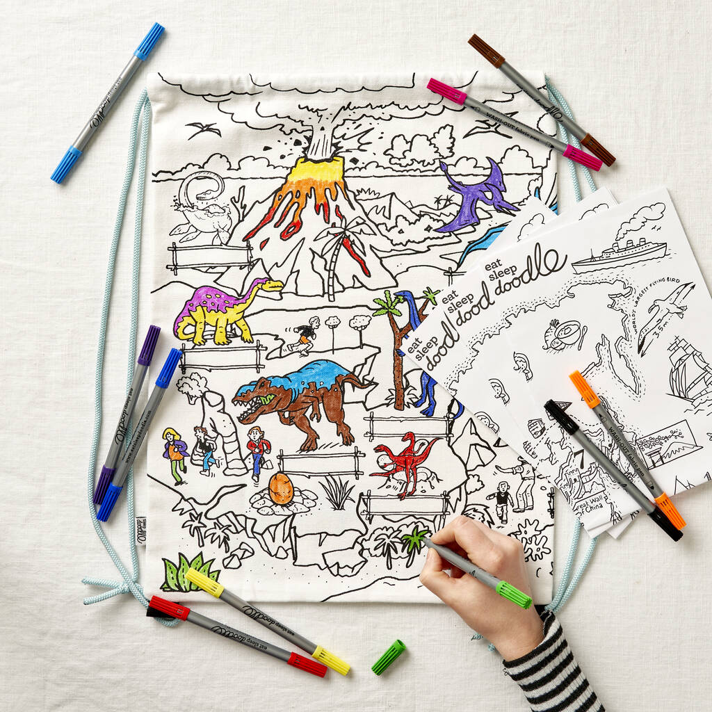 ¿Quieres llevar tu mochila de Dinosaurios y pintarlo allí donde vas? ¡Lo tenemos! Esta divertida y útil mochila para colorear viene con diez rotuladores de colores aptos para lavado. Los niños pueden aprender sobre los dinosaurios mientras colorean esta genial mochila con nuestro precioso dibujo de dinosaurios listos para colorear. Cuando estén listos úsala para el gimnasio, de paseo o para llevar al parque con una merienda y tu libro de Dinos favorito, ¿Quieres cambiarlo? Pues adelante, lava la mochila en un ciclo de máquina tibia, la tinta desaparecerá por completo y está lista para ser coloreada y redescubierta: ¡es el mejor regalo para los amantes de los dinosaurios!