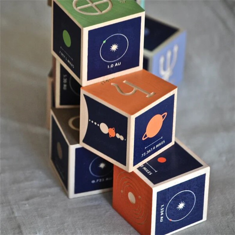 Mercurio. Venus. Tierra. Marte. Júpiter. Saturno. Urano. Dos grabados los lados muestran el símbolo, el nombre y el número de lunas del planeta. Los cuatro lados impresos revelan una ilustración del planeta, diámetro, ubicación, y la distancia del sol. Este conjunto de 9 bloques honra a los 8 planetas en nuestro sistema solar; más un planeta enano adicional, Plutón. Mucho por explorar: ¿Qué planeta tiene más lunas? ¿Y cuál menos? ¿Cuál es el más cercano a la Tierra? ¿Cuál está más lejos? ¿Cuál es el más grande? ¿El más pequeño? ¿Cómo los alinearás en orden desde el sol? ¿O apilados para complacer su ojo por el color y el diseño? este pequeño conjunto colorido también es uno de nuestros más populares.