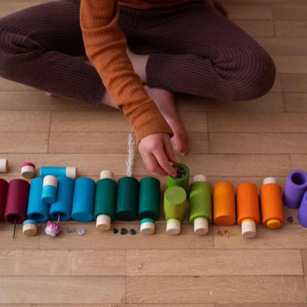 Los colores pueden desvanecerse levemente si entran en contacto con demasiado goteo, pero ¡tranquilxs! esto es completamente inofensivo para la salud de su pequeño. El mundo natural está lleno de hermosos colores que nos conectan con los días y las estaciones, así como con nuestras emociones y sentimientos. El taller de Grapat se encuentra en el idílico campo español. Debido a su proximidad a la naturaleza, algunos colores y tonos pueden variar levemente; por ejemplo, el viento o la humedad del aire pueden afectar los colores. Las superficies se tratan con ceras y aceites vegetales. Los aceites pueden tener un olor fuerte al principio, pero este se desvanece con el tiempo. Todos y cada uno de los juguetes de Grapat son únicos y están pintados a mano. Grapat ama y valora la naturaleza, y aprecia los "defectos" y el carácter que hacen de la madera un material tan increíble y único para trabajar. Algunos de los productos de Grapat vienen empaquetados en bolsas de tela que están hechas con telas sobrantes de grandes empresas, lo que significa que el material utilizado varía. Grapat trabaja junto con personas socialmente marginadas, así como con organizaciones benéficas que brindan apoyo a personas con problemas de salud mental.