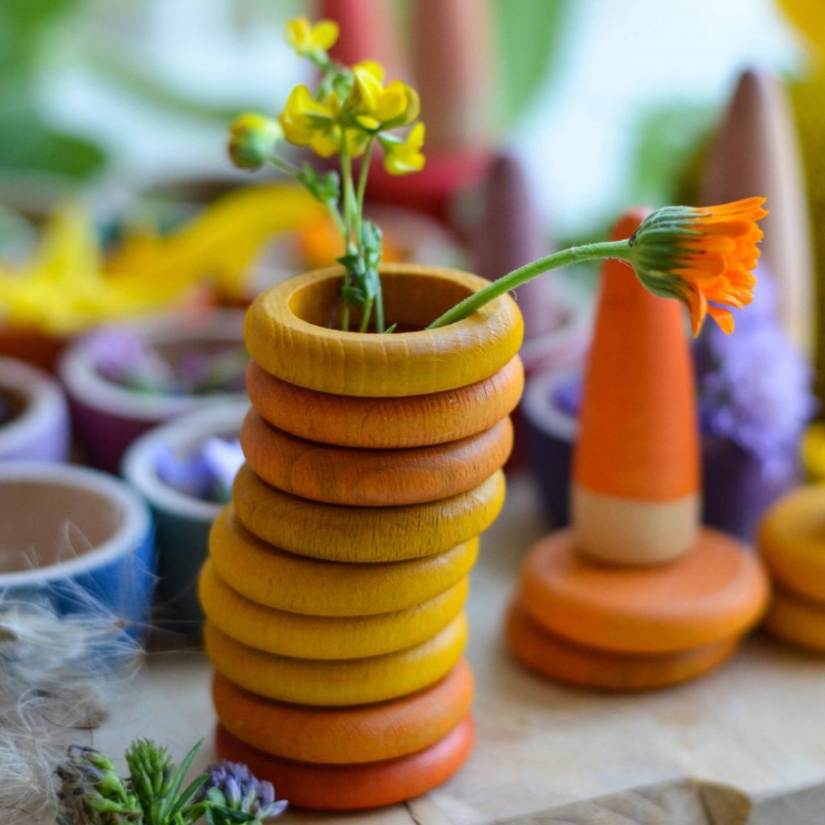 ¡Magníficos anillos de madera, pintados a mano en gama de colores pastel! Estos anillos de madera sostenibles permiten que la imaginación de los niños vague libremente: los anillos se pueden apilar, clasificar, contar, colgar, enrollar y los niños incluso pueden colocar sus Grapat Nins® en su interior. Este material propone su exploración para desarrollo de la creatividad. Puede ser empleado con el resto de material heurístico de Grapat y también mezclarse con las piezas para Mandalas que encontraréis en nuestra web. Apto a partir de 10 meses. Diámetro de las anillas 4 cm. Calidad y garantía Spiel-Gut.