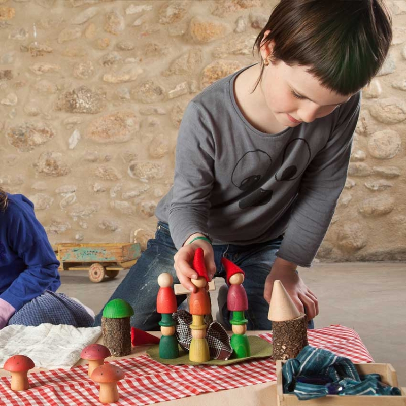Diversos elementos de juego que son insinuaciones para crear Mini Mundos, esos escenarios en miniatura que invitan a los niños y niñas a expresarse y a jugar a través de sus mundos internos que sacan al exterior desde el juego, la emoción, el movimiento, la imaginación… Son muchos los elementos que invitan al juego simbólico, a la invención de cuentos e historias… Los Nins, con chistera, con sombrero o sin, son los protagonistas de cuentos y leyendas; y los diferentes materiales que los acompañan crean escenarios donde vivir y sentir todo un mundo imaginario.
