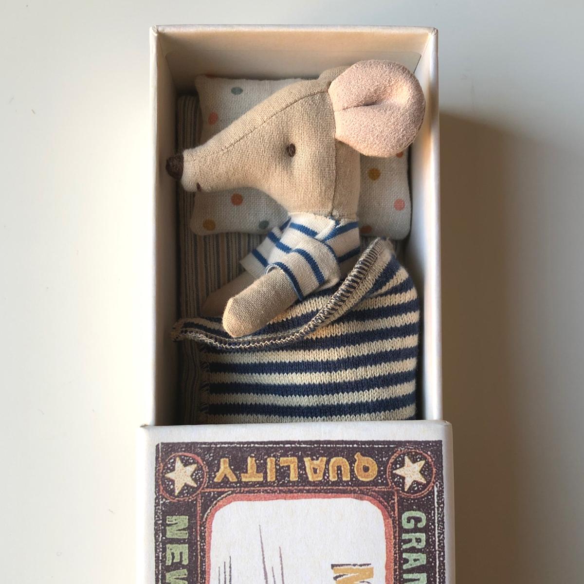Un divertido ratoncito, así es el nuevo Big Brother con su veraniego outfit. Camisa de rayas azul marino y blancas de algodón y un jeans de lino divino. Como muchos de los ratones Maileg, duerme en una caja de cerillas ¿Puede haber algo más tierno? ¡Pues es difícil!. Recupera la esencia de los cuentos al más puro estilo Andersen en su línea de ratoncitos. Completamente hechos en algodón y con la delicadeza y los detalles que encantan a grandes y peques. (Los vestidos pueden variar). Calidad Maileg. Apto a partir de 3 años.