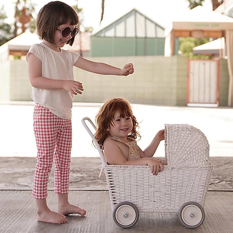 Strolley es un diseño revolucionario en el juego imaginativo. Esta cesta de mimbre tejida a mano y pintada, con ruedas cambia de cochecito a carrito de la compra, simplemente bajando la capota del cochecito. Perfecto para muñecas de hasta 30 cm, juegos de fantasía, frutas y verduras o para que tu pequeñx empuje sus juguetes favoritos. Apto a partir de 18 meses.