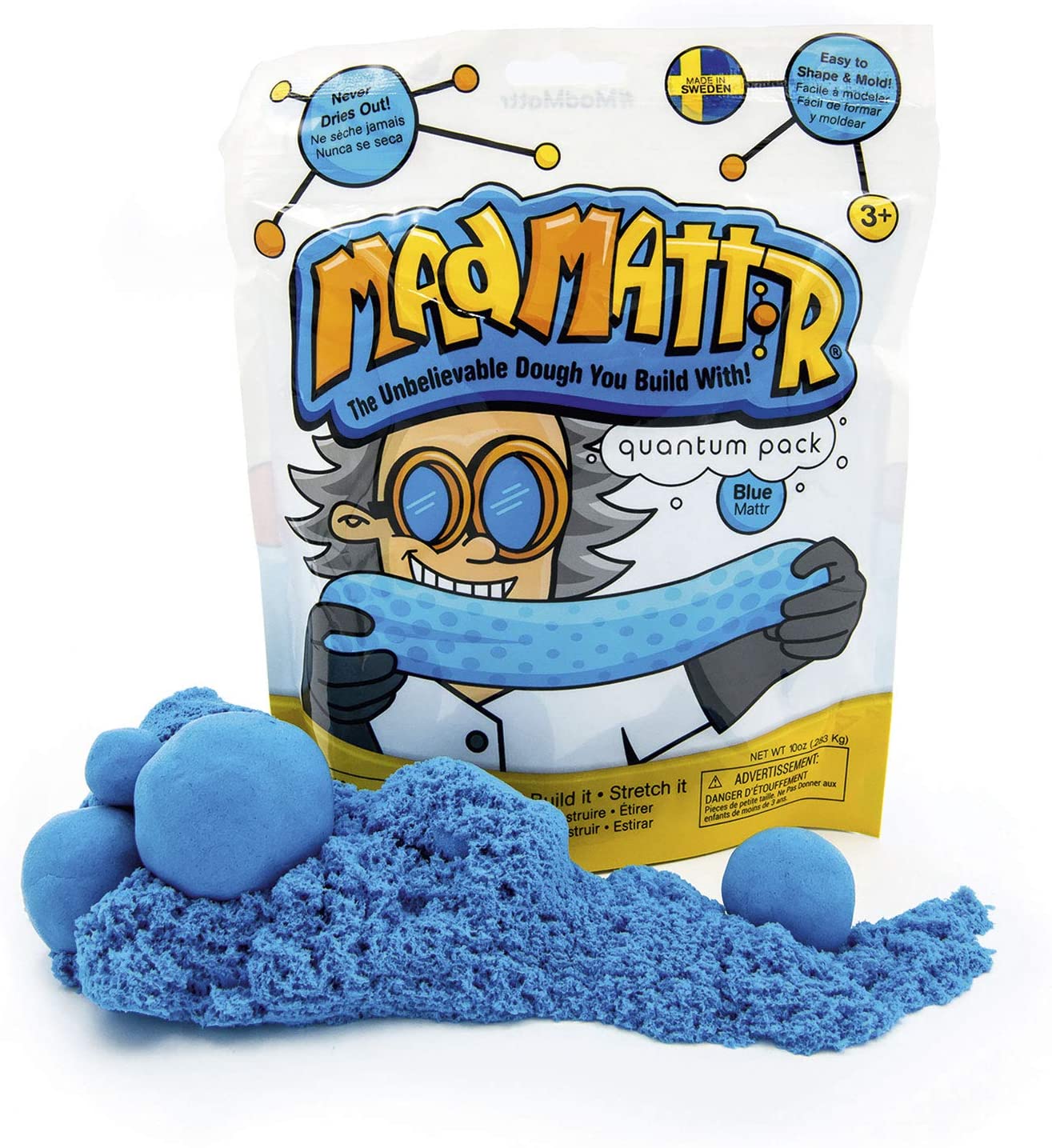 Mad Mattr es un material para amasar sorprendente, una masa que mezcla arena y plastilina lo que le da un efecto y textura esponjosa y blanda y muy abierta a imaginar y crear. ¡Venga! Estírala, amásala, comprímela, escúlpela!, compata muy bien y al separar se convierte en suave y sedosa. Si la estiras se alarga suavemente; si la comprimes, podrás cortarla, moldearla y realizar construcciones estables como si fuese un mosaico. En esta presentación encontrarás 283 gramos de masa con un bonito color azul para utilizar una y otra vez porque nunca se seca y es muy fácil de limpiar. Será tu color ideal pero si quieres, prueba a combinar con cualqueira de los otros colores Mad Mattr que encontrarás en nuestra tienda online. Ya sea con rojo, morado, fucsia o turquesa cualquier construcción está dispuesta areinventarse. Cualquier forma que le des, una vez comprimida, no se mezclará con los otros colores.