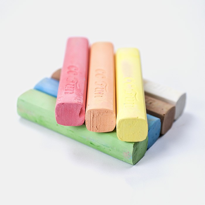 Una mezcla de yeso natural y tiza teñida con pigmentos. Para dibujar sobre pizarras, papel, piedra, hormigón, asfalto y muchas otras superficies. Casi sin polvo. La cubierta protectora mantiene los dedos limpios lo que la hace ideal para personas alérgicas. Cómoda forma cilíndrica para un dibujo fácil y alegre y robustas para poder usar en suelo y calle.