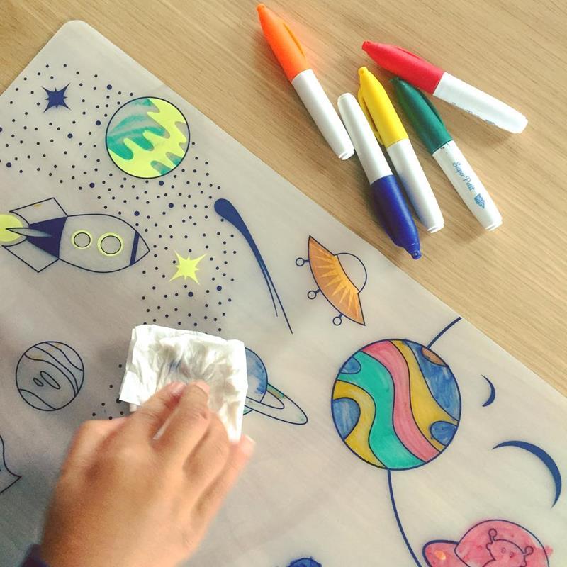 Sí, lo sabemos, a lxs niñxs les encanta colorear, por eso este mantel individual Espacio, flexible, práctico y fácil de llevar donde quieras, es una alternativa única y divertida pensada especialmente para tus peques. Fabricado sólo con 100% silicona alimentaria y libre de BPA y de Phtalates, el material es ecológico, resistente y reutilizable. El set incluye el mantel de silicona bellamente decorado,un pack de 5 rotuladores especiales y no tóxicos y una pulsera de silicona para llegar al "zero waste". Impreso con una ilustración que siempre tiene adeptos, el espacio exterior: cohetes, estrellas, extraterrestres y planetas, todo un mini mundo que invitará a llenarlo de color. Úsalo una y otra vez, pinta, borra y vuelve a pintar, no podrás parar de experimentar con él. Un producto seguro, ecológico, confiable y muy divertido ideal para viajes y para llevarlo a cenas y restaurantes. Se enrolla y dobla fácilmente para que siempre haya un espacio en cualquier parte para él. Apto a partir de 3 años.