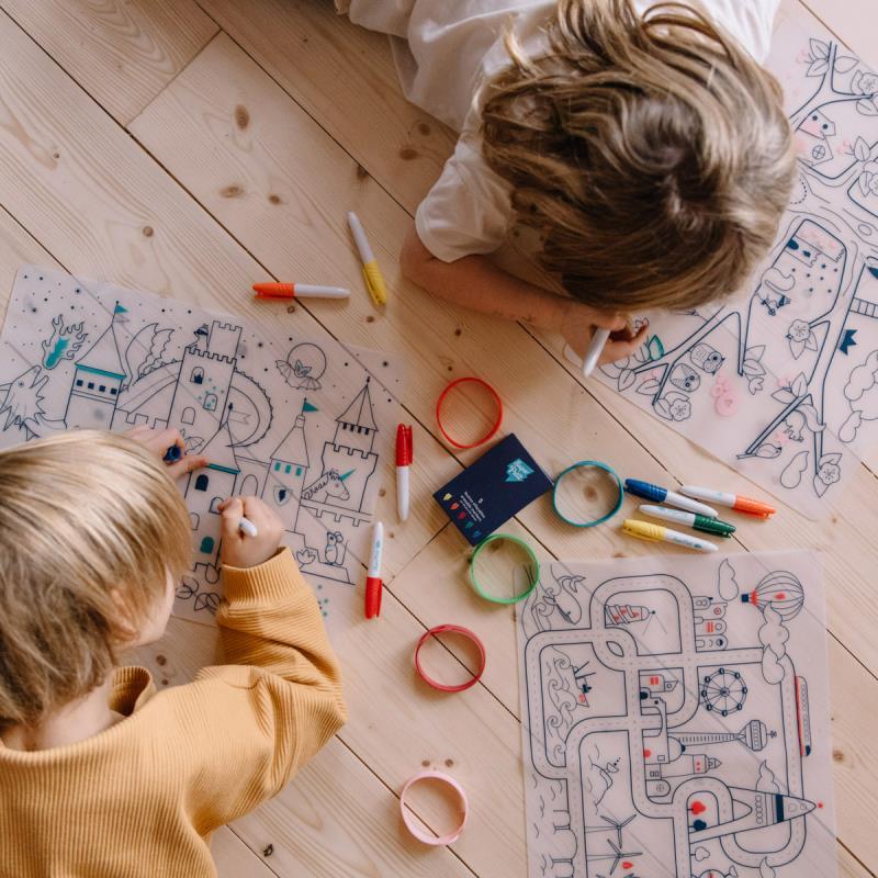 Sí, lo sabemos, a lxs niñxs les encanta colorear, por eso este mantel individual Castillo, flexible, práctico y fácil de llevar donde quieras, es una alternativa única y divertida pensada especialmente para tus peques. Fabricado sólo con 100% silicona alimentaria y libre de BPA y de Phtalates, el material es ecológico, resistente y reutilizable. El set incluye el mantel de silicona bellamente decorado,un pack de 5 rotuladores especiales y no tóxicos y una pulsera de silicona para llegar al "zero waste". Impreso, una ilustración divertida e inspiradora, el Castillo esconde secretos y seres maravillosos como dragones y unicornios. Pero también murciélagos, mapaches, ratones y búhos. ¿serás capaz de encontrar a reinas y reyes? Mira con cuidado porque no será tan sencillo descubrirlos. Todo un mini mundo que invitará a llenarlo de color. Úsalo una y otra vez, pinta, borra y vuelve a pintar, no podrás parar de experimentar con él. Un producto seguro, ecológico, confiable y muy divertido ideal para viajes y para llevarlo a cenas y restaurantes. Se enrolla y dobla fácilmente para que siempre haya un espacio en cualquier parte para él. Apto a partir de 3 años.