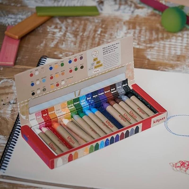 Fabricadas en Japón con cera de salvado de arroz. En la caja encontrarás 16 ceras de tamaño mediano en 16 colores diferentes (blanco, rosa, naranja, crema, negro, azul celeste, azul marino, azul oscuro, violeta, verde claro, verde oscuro, amarillo, rojo, gris y marrón). Recomendado para niños a partir de 3 años. Sin petróleo. Los padres y educadores tienen tranquilidad cuando sus niños pequeños y niños usan Kitpas.