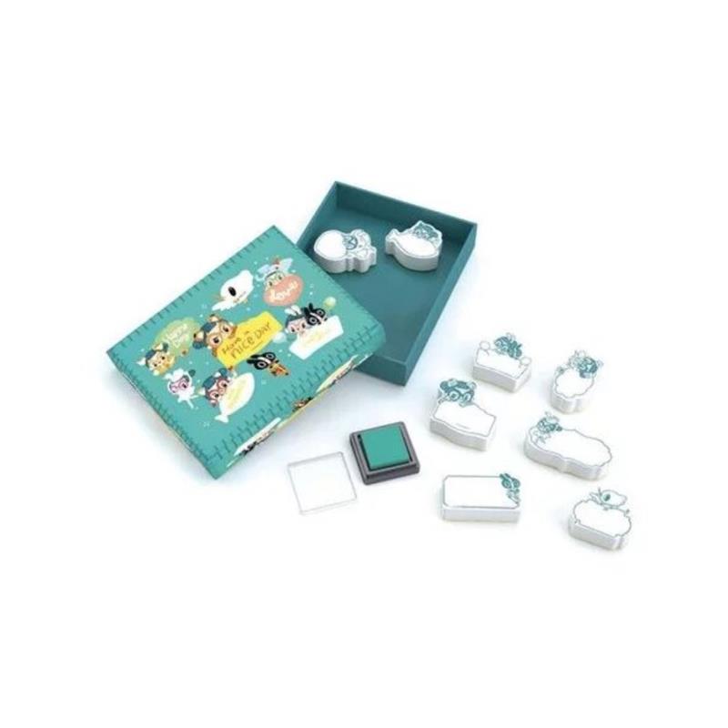 Descubre los sellos con mensaje con el diseño de Lam Pei de Djeco, 8 sellos de espuma y su almohadilla de tinta en una caja de almacenamiento para niños y niñas a partir de 6 años. Una vez depositada la forma del sello en el soporte, solo queda escribir un mensaje personalizado en la parte vacía (bocadillo).