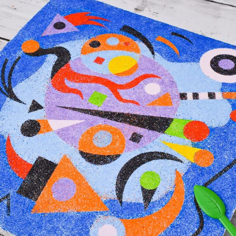Este kit creativo incluye actividades de pintura con ilustraciones inspiradas en el estilo abstracto del gran maestro Vassily Kamdinsky. Los niños añaden colorescon los botes de arena coloreada. El folleto explicativo da información sobre el artista y el movimiento artístico al que pertenece.
