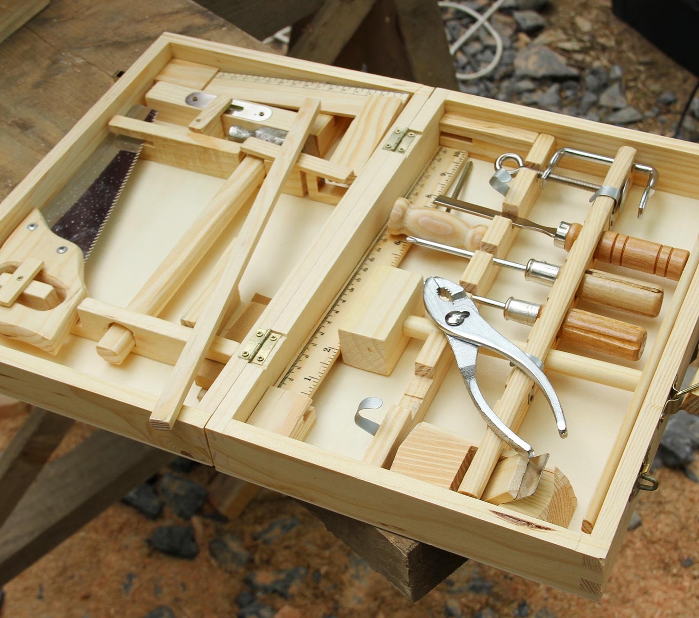 and a spirit level, all packed beautifully into a lovely wooden carrying