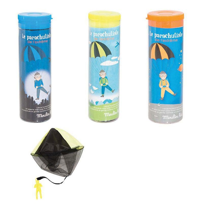 ¡Otra pequeña maravilla de Moulin Royt! un clásico de la infancia, este paracaidista será muy divertido para lanzar muchas veces y jugar en casa o al aire libre. Lánzalo hacia arriba y mira cómo desciende estable y suavemente. Podrás lanzarlo muchas veces gracias a su red inferior con un solo punto de agarre al muñeco, evita hilos que se enredan y dificultan el juego. No podemos garantizar un color concreto. De modo que al comprarlo podrás recibirlo en cualquiera de los tres colores disponibles (azul, amarillo o naranja). Apto a partir de 3 años.