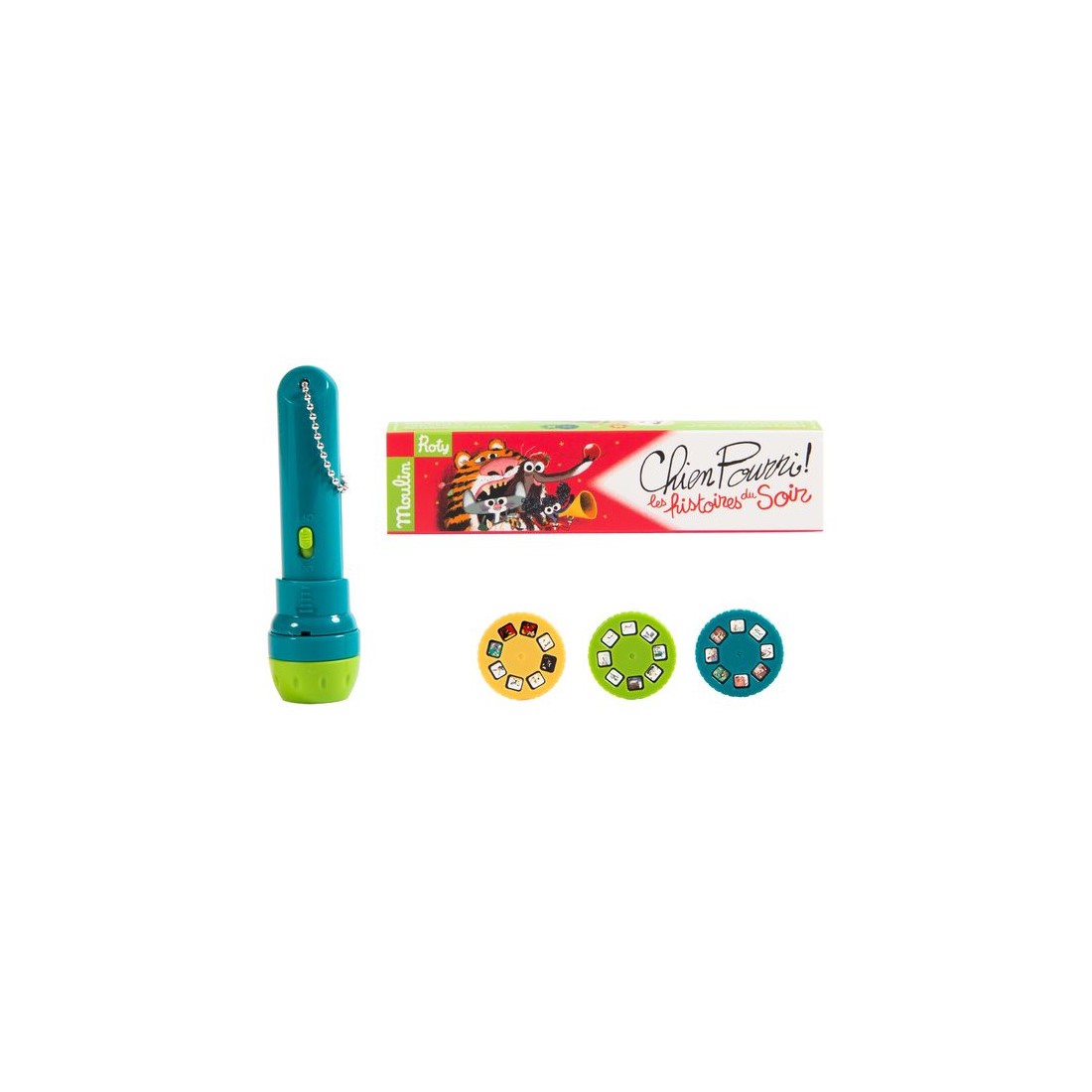 Un objeto fascinante de las "Pequeñas maravillas" de Moulin Roty, esta linterna de historias funciona como un proyector, una especie de cine portátil para que lleves y cuentes historias allí donde vayas. De excelente calidad de imagen, dispone de una rosca para ajustar el foco de la imagen proyectada, consta de 3 rueditas con 8 fotogramas cada una. Diversión asegurada para peques y mayores que dejarán volar su imaginación. Con esta cómoda linterna de bolsillo podrás reinventar y narrar las delirantes aventuras de "Perro Apestoso", héroe bromista basado en las historias literarias creadas por Colas Gutman y Marc Boutavant. Las coloridas ilustraciones llevan al niño a un mundo imaginario donde hay de todo para inventar. Calidad Moulin Roty para niñ@s a partir de 4 años. Baterías incluidas.