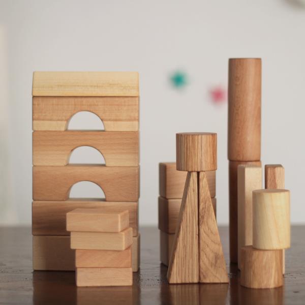 Our toys improve senses, they are soft to the touch, they catch your eye with natural colours and they smell of wood. With wooden blocks you can conjure the most amazing buildings.Freedom in creation stimulates inventiveness, awakes imagination. This blocks set comes in cotton sack, to give joy when playing and please the eye as the original decorative element of the interior. Made from a selection of wood that comes from FSC certified suppliers. Natural , eco-certified pigments. Finished with beeswax and botanical oils, sanded perfectly smooth, soft to the touch. Free of harmful chemicals. Product eco. Made in the Beskidy Mountains, Poland.
