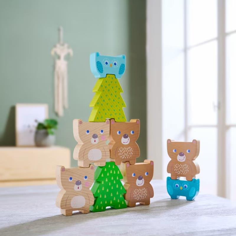 Los amigos del bosque están acostumbrados a cuidar los unos de los otros. Por eso se sujetan por las patitas y se divierten sujetándose unos a otros para hacer torres es por eso que ¡Se buscan hábiles apiladores y apiladoras! Y es que aquí lo importante es apilar con la mayor precisión y habilidad posibles, a la lechuza, al oso y compañía. Pueden apilarse libremente o siguiendo los modelos de las plantillas, con diferentes grados de dificultad. ¡Comenzamos! Fabricado en madera lacada procedente de bosques sostenibles. Prueba diferentes posiciones y alturas en combinaciones a tu gusto. Calidad Haba