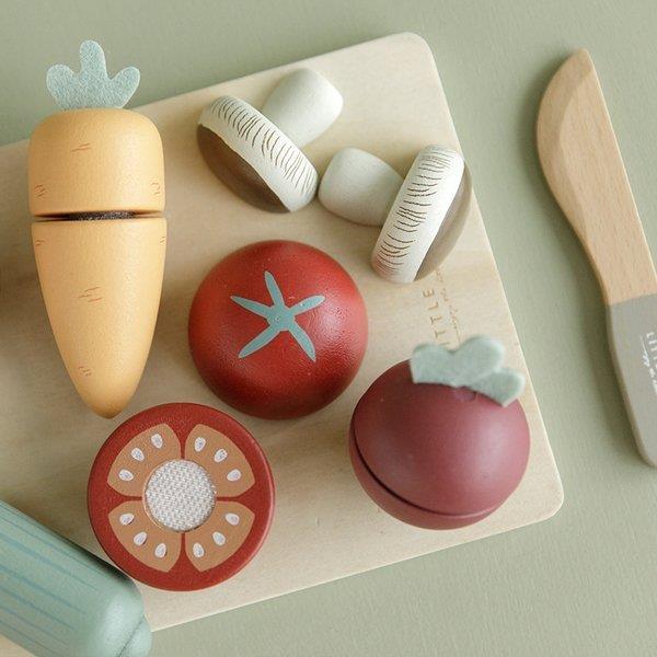 Piezas de madera con unión de velcro para estimular y desarrollar la coordinación ojo mano. Usa el cuchillo de madera incluido para cortar las verduras ¡como en la vida real!. Piezas de madera robusta y preciosamente acabada para favorecer el juego imaginativo aportando realismo. Rábano, zanahoria, pepino, tomate, cebolla y champiñón, una manera de acercar a los niños y niñas al consumo de las verduras. Un maravilloso juego manipulativo que desarrolla la motricidad fina, la pinza y también el desarrollo del lenguaje así como el aprendizaje de roles y la socialización. Apto a partir de 2 años. Diseño y calidad Little Dutch.