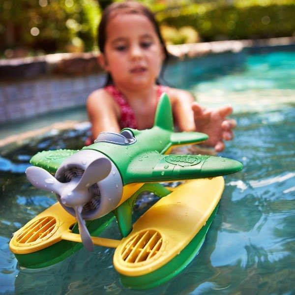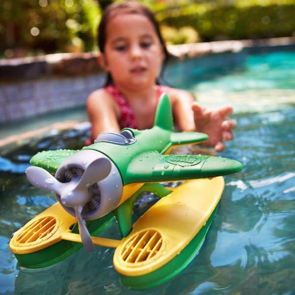 Float, fly, and find Good Green Fun™ no matter how you travel! The Green Toys® Seaplane is ready for earth-friendly excitement in the sky or out at sea. Made in the USA from 100% recycled plastic milk jugs that save energy and reduce greenhouse gas emissions, this buoyant yellow and green floatplane features a spinning propeller and chunky, oversized pontoons perfect for coasting into any port. Specially designed to float when taken into the bathtub or pool, young captains can easily navigate from water to air and back again. No BPA, phthalates, PVC or external coatings, and also meets FDA food contact standards. Dishwasher safe for easy cleaning. Packaged with recycled and recyclable materials and printed with soy inks