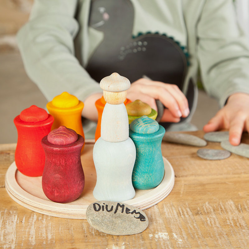 Un juego afin a la Pedagogía Waldorf que ayuda a los pequeños de casa a entender el paso del tiempo. Incluye 7 Nins®-bellota en 7 colores que se asocian a cada día de la semana. 7 vasijas y 1 plato redondo (18cm de diámetro) donde colocar los elementos a modo de mesa-estación