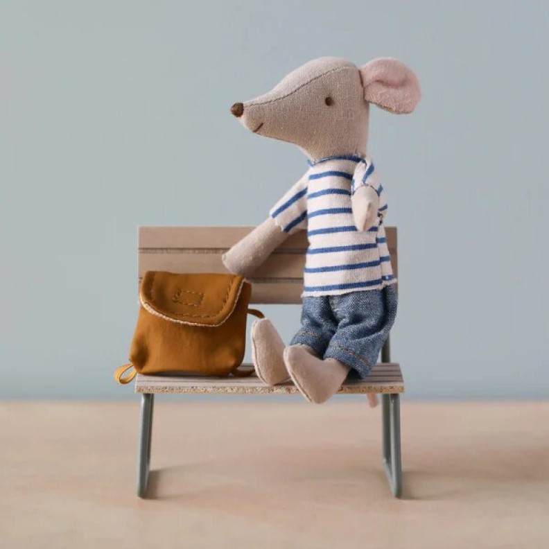 "Riiiing" está a punto de sonar la campana que inicia el cole, y muy contento y con ganas de pasarlo bien, a de prisa el ratoncito hermano mayor, vestido para un día en la guardería o la escuela, lleva su mochila verde a la espalda. Tiene imanes en sus manos para sostener las manijas del triciclo para un viaje rápido. Los triciclos pueden comprarse en nuestra web. Compatible con todos los accesorios de casas de muñeca Maileg