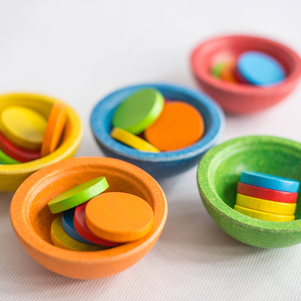 ¡Un maravilloso juego polivalente!. Con las tazas de colores para ordenar y contar se puede jugar de varias maneras: Clasifique cada ficha por color y colócalas en los cuencos correctos. Siéntate a una distancia corta e intente lanzar cada ficha y atinar introducirlas en su vaso correspondiente o crea tu propio juego creando patrones para contar y/o clasificar como base educativa. Un Divertido juego de trasvases también. Los cuencos pueden emplearse en mesas sensoriales con arena o cuentas. Los cuencos de colores de Plantoys, combinan bien con otras actividades educativas o de educación en el hogar. Estímulo visual: Cada chip o moneda y taza tiene colores brillantes con tintes a base de agua no tóxicos para estimular a los niños visual y cognitivamente. ¡Esto también facilita el seguimiento de cada pieza para guardarla de forma segura después de jugar! Fabricado de forma sostenible: Hecho a mano con madera de caucho sostenible y con Planwood (material a base de serrín de madera comprimida a altas temperaturas y sin pegamentos con formaldehídos. Todo teñido con tintes no tóxicos, el juego Sort & Count Cups es óptimamente seguro para los niños y no tiene bordes afilados. Apoya el desarrollo: Fomenta el reconocimiento de colores, ayuda a desarrollar habilidades básicas de contar y clasificar, apoya y facilita la comprensión de los patrones y la secuenciación, mejora las habilidades motoras finas y la coordinación ojo-mano. Se sugiere el juego autodirigido, ¡pero jugar con un compañero o con un padre es aún más divertido! ¿Qué encontrarás dentro de la caja?