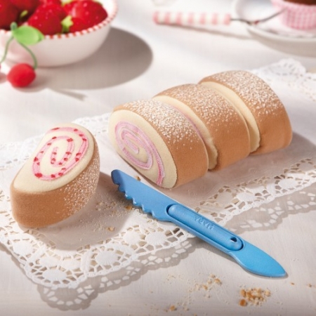 Un suave pastel de tela para disfrutar de una taza de té o chocolate caliente. Un delicioso postre, Brazo de gitano con nata y fresas, para deleitarse con amig@s y muñec@s. Un juego realista y delicioso para peques amantes de la buena repostería. Calidad incomparable Haba. A partir de 3 años.