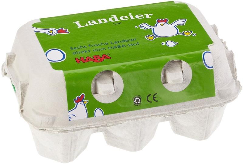 Six eggs in a carton. Material wood tinted no toxic. Ages + 3 years. haba Quality, made in Germany."
