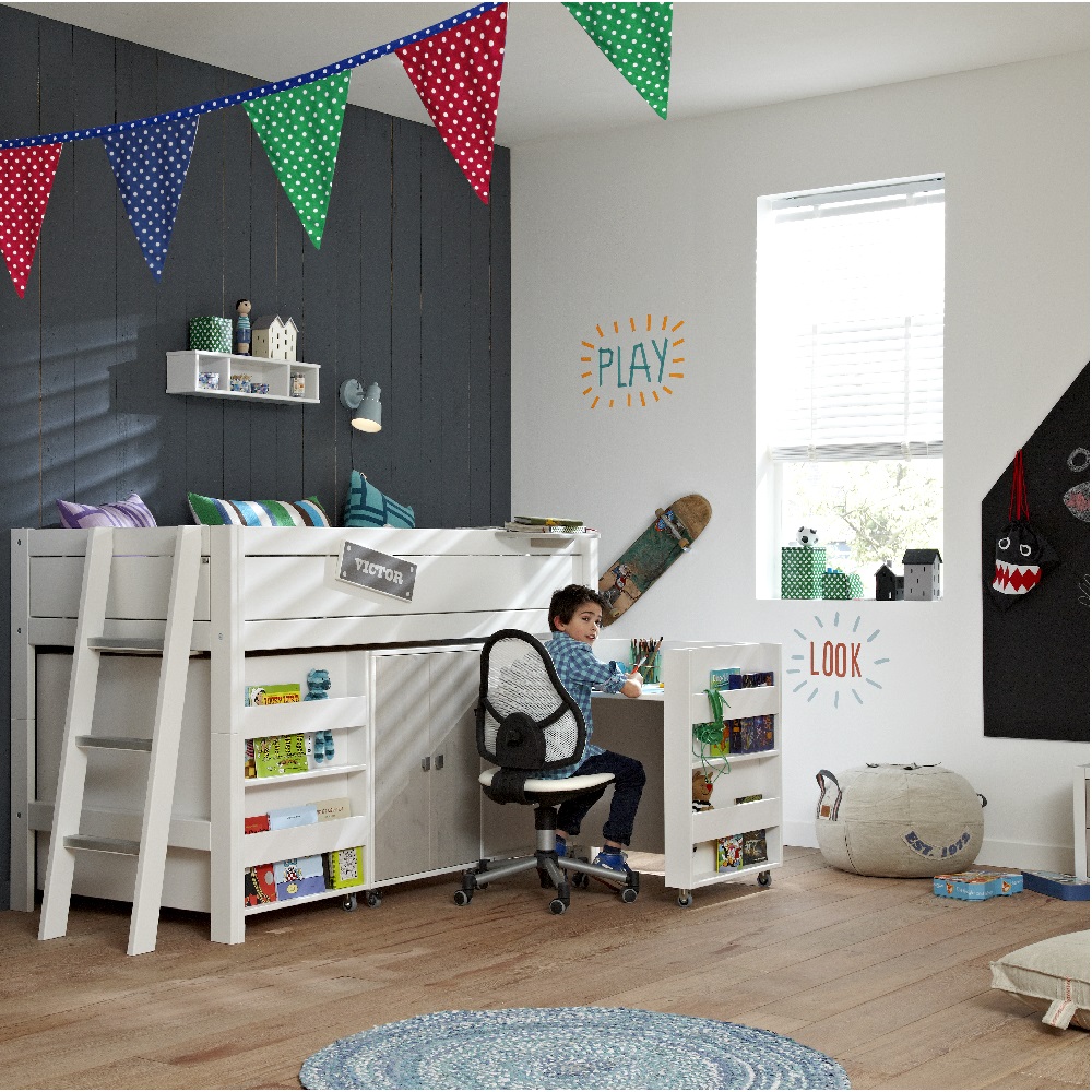 Una habitación funcional, con cama en altura, cajones y espacio de almacenaje debajo y adosado un cómodo escritorio con ruedas que podrá ocultarse cuando no se esté usando devolviendo el espacio de juego a la habitación. El frontal posee una librería pequeña y cómoda para que sus cuentos y libros favoritos siempre estén a su alcance. Una combinación maravillosa y de gran calidad para cuando los peques y las peques requieran espacio de trabajo en su habitación. Calidad Lifetime. Consúltanos presupuesto y opciones de combonación y acabdos.