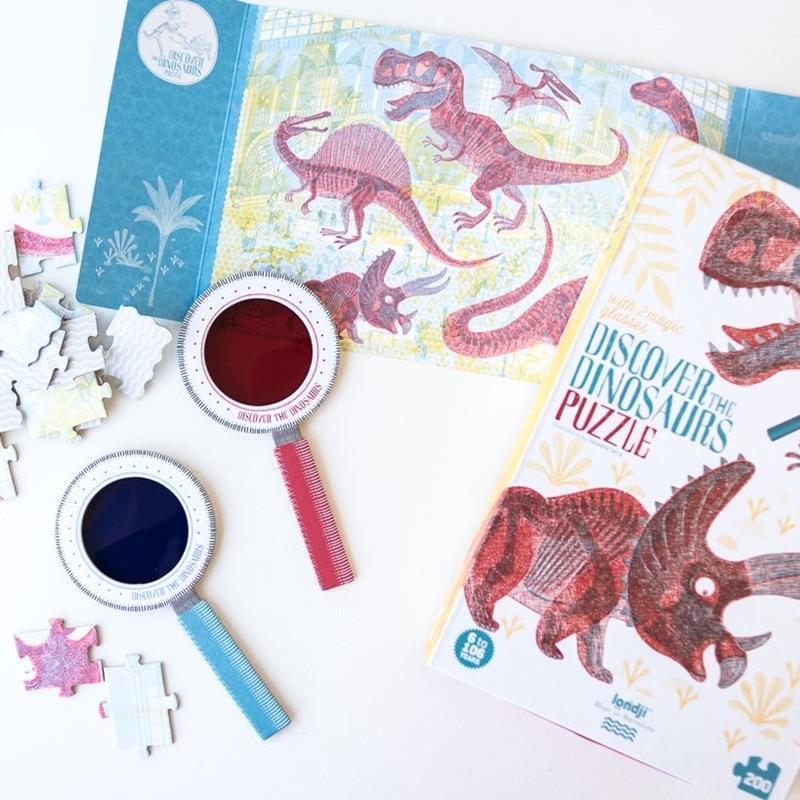 Mira a través de la lupa azul y viaja al jurásico con Londji. Descubrirás impresionantes Tiranosaurus rex, diplodocus y espinosaurus paseando en medio de volcanes. Ahora coge la lupa roja y verás como los huesos fosilizados de estos gigantes han pasado a formar parte del museo de ciencias naturales. Un puzzle en el que podrás descubrir dos realidades, una con la lupa roja y otra bien distinta al utilizar la lupa azul. El juego incluye un puzzle de 200 piezas y dos lupas para descubrir los dos universos. Apto para niños y niñas con interés paleontológico desde los 6 hasta los 103 años. Calidad Londji
