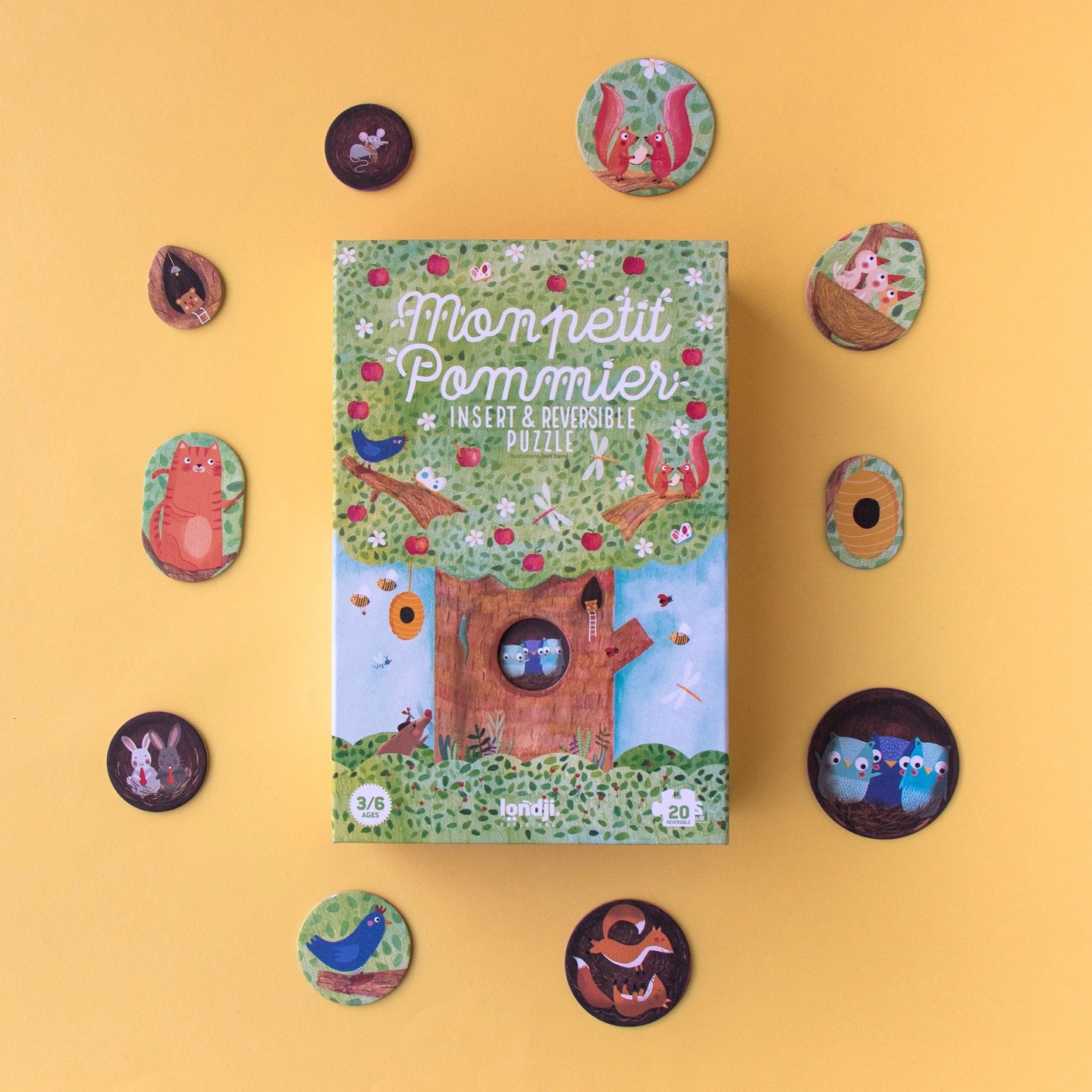 Mon Petit Pommier es el puzzle definitivo para amantes de la naturaleza. Las bellas y divertidas ilustraciones de Txell Darné enamorarán a todos en casa. Por una cara un precioso manzano en primavera lleno de frutas, vida y juego y, por la otra, ese mismo árbol durante el otoño, con sus manzanas y todos los animalitos que hacen de él su casa, listos para pasar el frio e hivernar. Lleno de detalles para crear historias paralelas este puzzle de 20 robustas piezas de cartón reciclado se comparte entre 10 piezas típicas de puzzle y 10 piezas para encajar a los animalitos en su lugar correcto. Un puzzle lleno de colorista alegría que hará las delicias de más de uno en casa. Apto a partir de 3 años. Calidad y diseño Londji. Dimensiones del puzzle armado: 40 x 67 cm.
