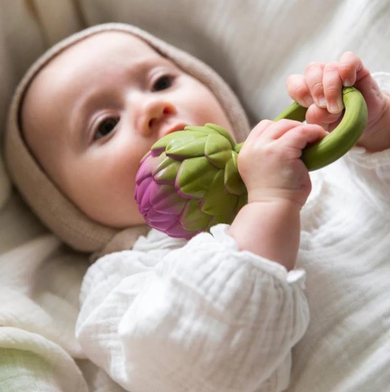 "Alivia la dentición y estimula los sentidos de tu bebé con el Mordedor Alcachofa de Oli & Carol. Natural, sostenible y lleno de ternura. ¡Cómpralo ahora!"