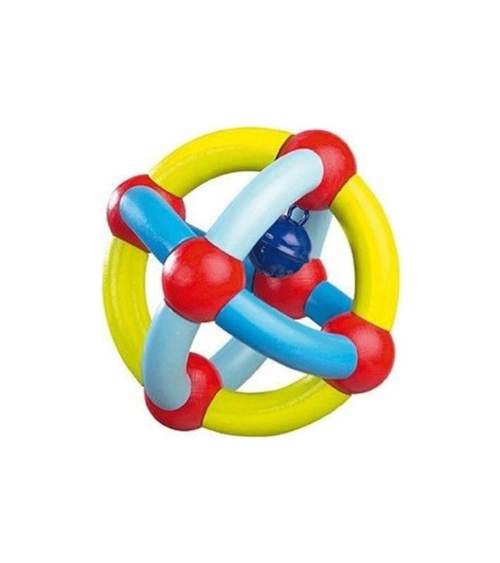 Este sonajero es un maravilloso aro mordedor. Está fabricado en madera con elementos de madera de arce enlazados por una resistente goma envuelta en tela roja. La madera está lacada con tintes solubles al agua completamente atóxicos. Tu bebé adorará hacerñlo sonar y mover sus piezas explorándolo con curiosidad. Un cascabel en el medio hará las delicias con su sonido brillante y dulce. Podrá llevarlo a la boca sin problemas debido a sus altísimos estándares de seguridad. Su tamaño es ideal para las manitos pequeñas. Fabricado en Alemania. Apto a partir de 6 meses.