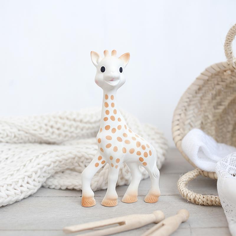 ¡El primer juguete del bebé que despierta todos sus sentidos! · La vista: Gracias a sus manchas oscuras y contrastadas en todo el cuerpo atrae la mirada del bebé y se convierte en un objeto familiar qe le tranquiliza al reconocerlo fácilmente. · El oído: Provista de un silbato interno, divierta y estimula el oído del bebé y le ayuda a comprender la relación causa-efecto. · El gusto: Flexible y dotada con muchas partes para morder (antenas o cuernos, patas) es ideal para aliviar las encías del bebé en la primera dentición. · El tacto: Ligera, Sophie se adapta perfectamemte a las manitas pequeñas de l@s bebés, sus largas patas y su cuello le permiten asirla fácilmente. Su tacto suave, como la piel de mamá, tranquiliza al bebéy le aporta reacciones fisiológicas y emocionales que le transmiten calma. · El olfato: El perfume singular del caucho natural extraído de la Hevea le confiere una verdadera particularidad, por lo que el/la niñ@ le identifica entre el resto de juguetes. Sophie está fabricada en látex natural y colorantes alimentarios. ·La línea So’pure®de Sophie la Giraffe es la más natural y ecológica de la gama Sophie. La colección SO'PURE ofrece productos hechos con 100% algodón orgánico, fibra de maiz y caucho 100% natural. Todos los productos de la colección So'Pure están presentados en un atractivo embalaje eco y presentación que incluye un pack de regalo personalizable.