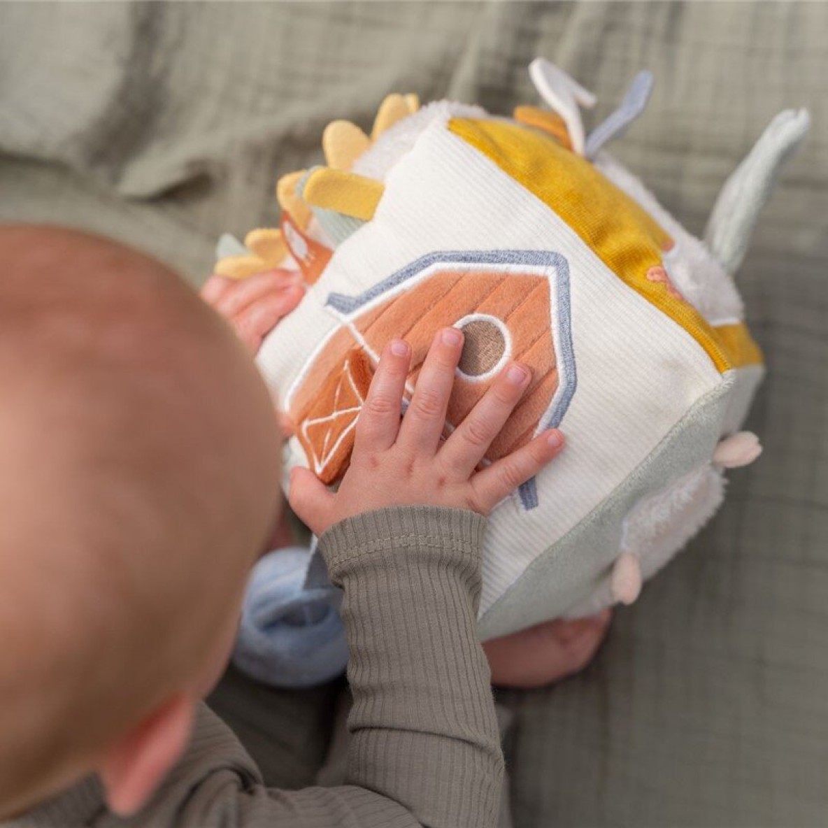 Gracias a su tacto suave y acolchado, este cubo sensorial es seguro y confortable para los bebés, ofreciendo entretenimiento y formación en etapas muy tempranas. Sus tonos neutros y motivos de granja encajan perfectamente en entornos Montessori o de juego libre.