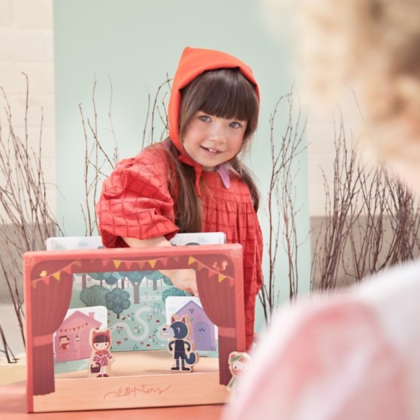 El cuento clásico de Caperucita Roja en un teatro de madera.