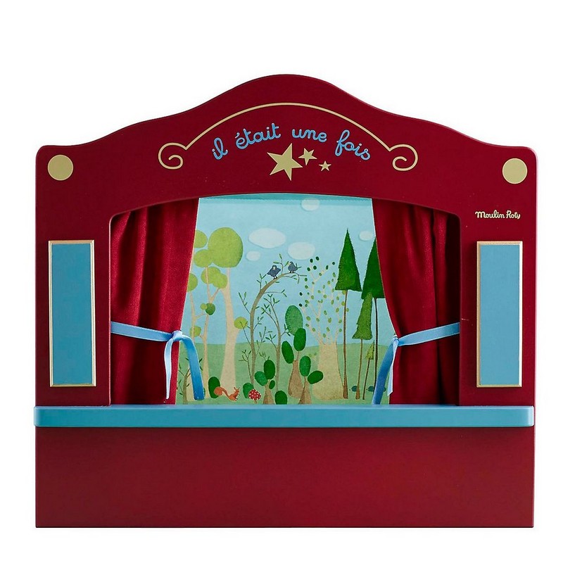 Once Upon A Time..... The Moulin Roty Petit Theatre de Marionnettes Rouge is a beautifully crafted wooden theatre. Ideal on top of a table the wooden theatre is already assembled and simply unfolds and is immediately ready for the first puppet show. The red velvet curtains can be opened by sliding along the wooden dowel and are tied into position with the blue ribbon. The theatre comes supplied with one hanging backdrop which details a Fairy Castle in the background and toadstools in the foreground. The Moulin Roty hand puppets compliment this theatre and make this the perfect heirloom theatre and puppet toy for the whole family to enjoy re-telling favourite fairy tales. A Childrens Puppet Show is much loved past-time enjoyed at every generation so liven up story time and enjoy rainy afternoons jam packed with imagination