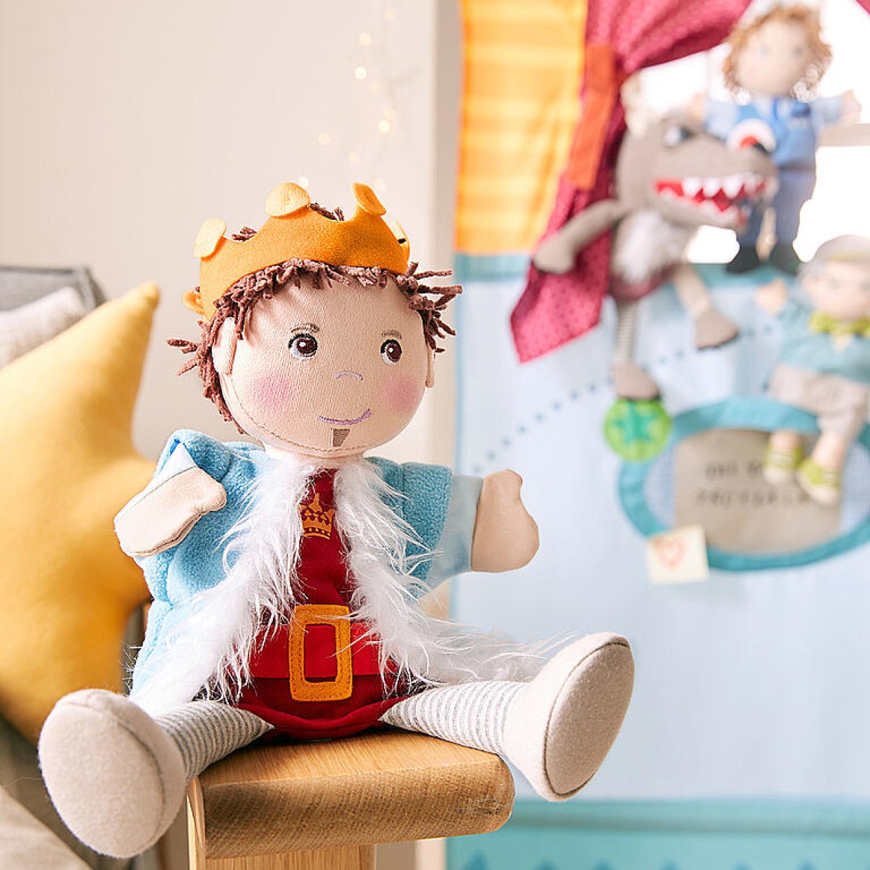 Sube el telón y aparece un Príncipe, muy de cuento, porque es un príncipe con capa azul... ¿Cómo se llama la obra? ¡Pues como quieras! pues con esta preciosa marioneta de Príncipe podrás recrear historias conocidas o inventarte historias propias y novedosas... ¡Todas las que quieras!. Podrá ser un príncipe malvado o bueno, divertido o arrogante, feliz o enfadón ¡Tú tienes el mando! Fabricado en algodón y microfibra, lleno de detalles y carita bordada para que aún las manos y bocas más pequeñas de casa no tengan ningún riesgo con piezas que se desprendan . Calidad Haba.