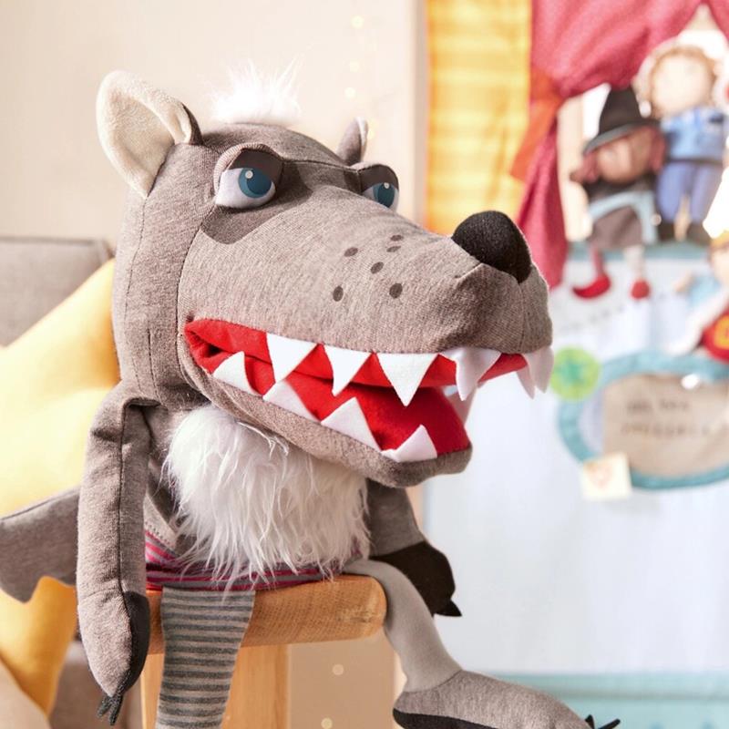 El lobo Grisbert no da mucho miedo. Pero su entrada en el teatro de marionetas siempre es muy notada por los niños. Gracias a esta marioneta, grandes y pequeños podrán recrear parodias imaginativas o sus propias creaciones. Con elemento de ruido de papel arrugado en la boca para mayor realismo