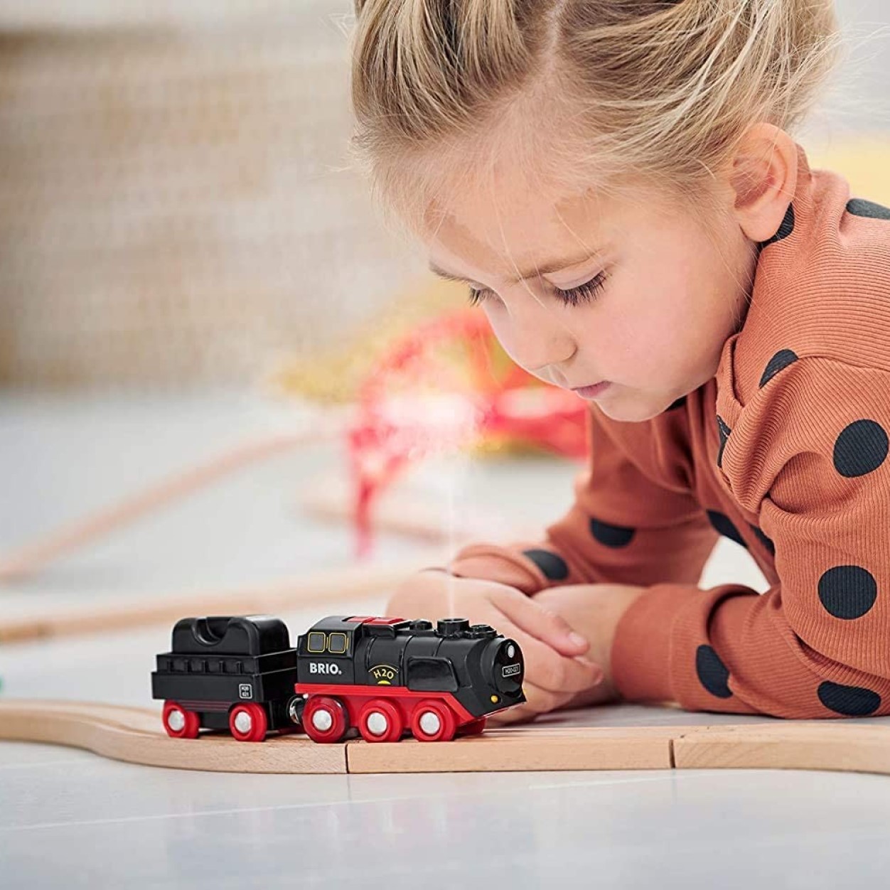 «¡A toda máquina!». Disfruta de un emocionante viaje por las vías de BRIO World con efectos realistas de vapor con el tren de vapor a pilas 33884. La locomotora a pilas produce un vapor seguro al tacto, que sale por la chimenea a medida que avanza por las vías. Si te quedas sin agua, puedes rellenar fácilmente la locomotora utilizando la carga de agua de la que tira la locomotora. Pulsa el botón rojo de avance de la parte superior de la locomotora. Se encenderán los faros delanteros, comenzará a salir vapor y podrás embarcarte en otra emocionante aventura ferroviaria. Compatible con todos los accesorios y circuitos del Brio Railway System. Requiere 2 baterías AAA no incluidas.