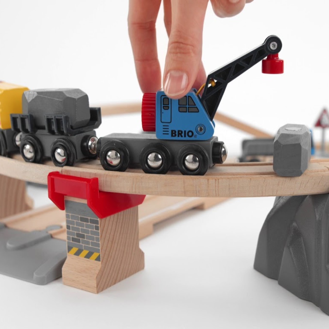 Es hora de levantar algo de peso. Este juego de carga por ferrocarril y carretera de 32 piezas está repleto de vehículos temáticos de construcción que incluyen un vagón grúa portátil y 2 camiones volquete en funcionamiento. Lleva la acción a múltiples alturas usando los soportes de las vías del tren y conéctate con las carreteras con el cruce ferroviario para vivir una experiencia BRIO World completa.