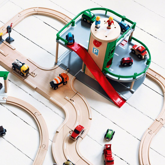 Bring the world of rail and road toys together in this unique toy parking garage with multiple levels of fun! Drive to the top and park, take the chute down, fuel up on level 1 or place the car on the ramp on level 2, press the button and see how the car falls into place on the car transporter wagon below on the railway track. This is an educational wooden toy that connects to all railway and roadway in the BRIO system. From 3 years & up.