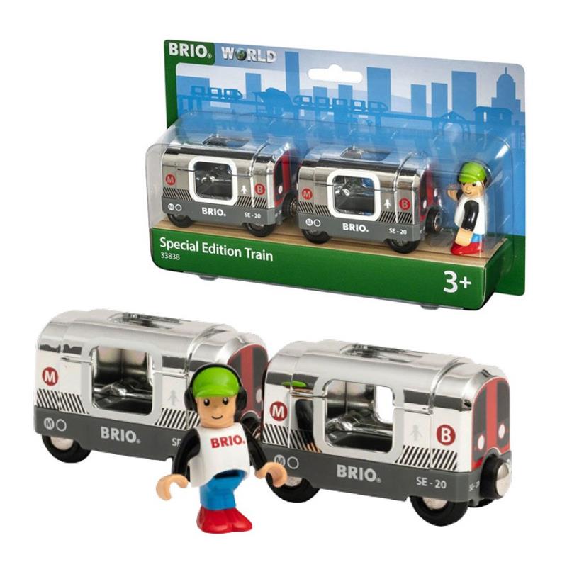 El tren de edición especial (2020) 33838 no pasará desapercibido en ninguna red ferroviaria BRIO World. Este tren de metro especial con superficies plateadas, gráficos realistas y un acabado muy brillante será la sensación de la red ferroviaria y se sentiría como en casa en cualquiera de las redes de metro del mundo. Tanto locomotora de metro como el vagón de pasajeros cuentan con puertas que se pueden abrir y espacio para varias figuras BRIO World, así como las habituales conexiones magnéticas. No te pierdas esta oportunidad de hacerte con este tren de edición limitada, y su pasajero con auriculares modernos.